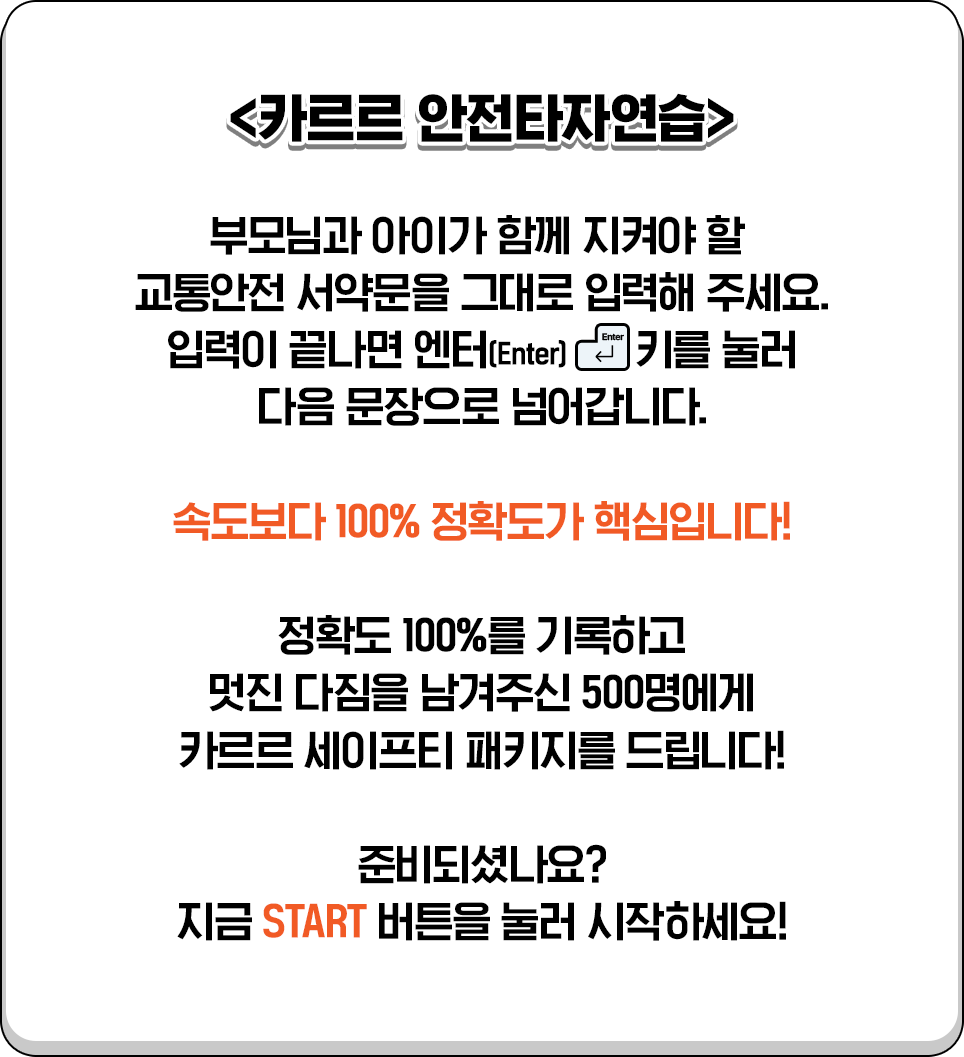 ![1.안전서약 다짐상 대상 : 정확도 100% + 한 줄 다임 기준으로 500명 선정 경품 : 카르르 세이프티 패키지(헬멧+보호대+짐색) 기준 : 1.안전 메시지 적합성 2.창의성 3.표현력 4.공감도를 기준으로 평가 [경품 유의 사항] 헬멧 색상은 블루와 화이트 중 랜덤 발송 됩니다. 블루 헬멧에는 화이트 짐색, 화이트 헬멧에는 블루 짐색이 제공됩니다. 카르르 세이프티 패키지(500명) 2. 참여상 대상 : 이벤트 응모 완료자 중 5,000명 추첨 경품 : 네이버페이 1,000원 네이버페이 1,000원(5,000명) 3.Car케어상 대상 : 이벤트 응모 완료자 전원 경품 : Car케어 서비스 경정비 2만원 할인권 Car케어 서비스 경정비 2만원 할인권(전원) Car케어 가입자라면? 참여상(네이버페이) 당첨 확률 2배 UP!(25년 11월 11일까지 가입자 대상)](images/evt_info_text.png)